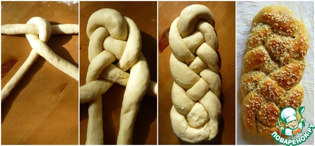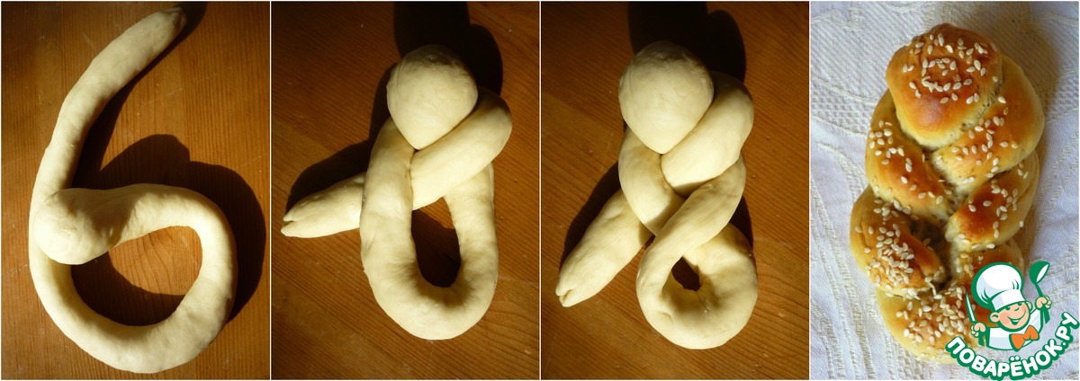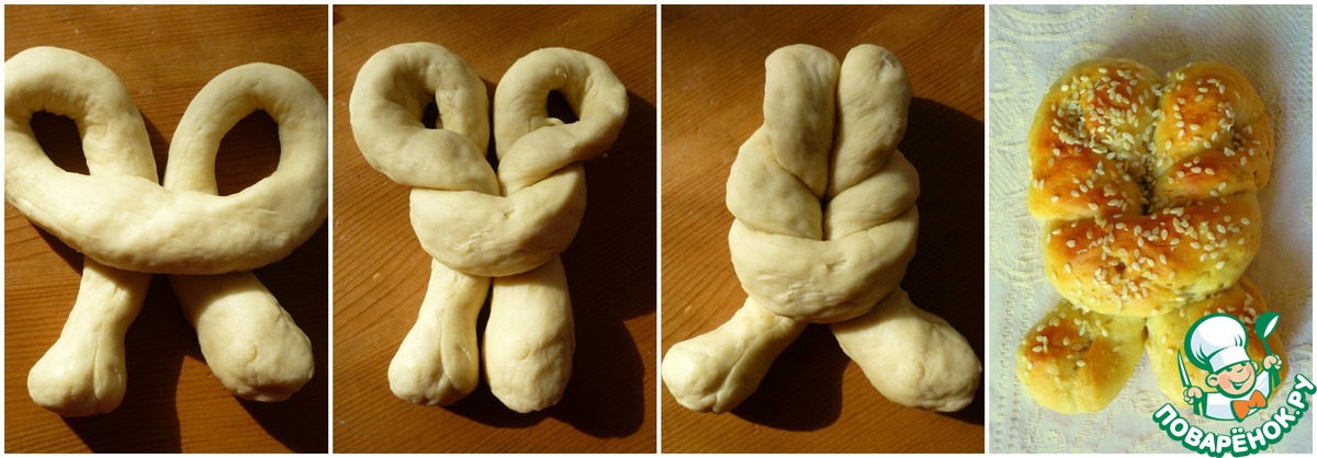 Формовка изделий. Я предлагаю испечь 4 вида хлебо-булочных изделий. Итак, первая завитушка. Катаем два одинаковых валика, концы которых скручиваем в спираль в разных направлениях. Потом просто накладываем их друг на друга и подкручиваем.