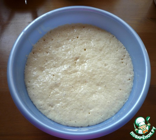 Опара. Муку просеить. Теплое молоко и сахар смешать с таким количеством муки, чтобы получилось тесто гуще, чем на оладьи. Туда же добавить дрожжи смешанные с небольшим количеством муки и замесить опару. Оставим ее в теплом месте до увеличения объема в 2-3 раза. Муки на этом шаге нужно около 200г.