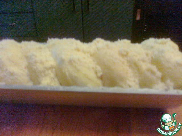 получили готовое к разделке тесто. Припыляем стол мукой и выкладываем