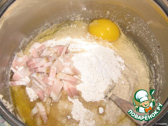 Ввести в опару 0,5 стакана пшеничной муки (я снова заменила овсяной), бекон, яйцо, соль и растительное масло и снова оставить подходить