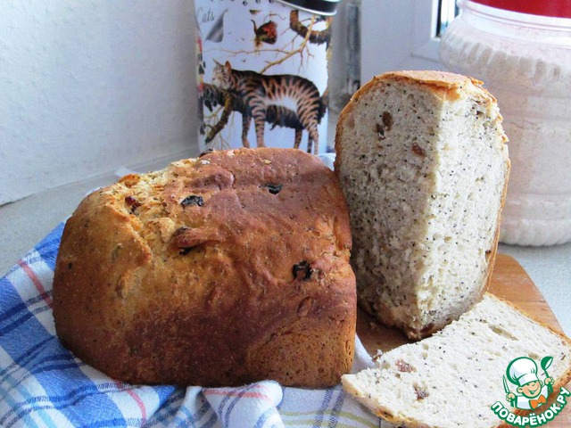Молоко смешать с водой. Согласно инструкции заложить все компоненты, кроме изюма, в ведро ХП. Режим основной, 2,5 часа. По сигналу добавить изюм.