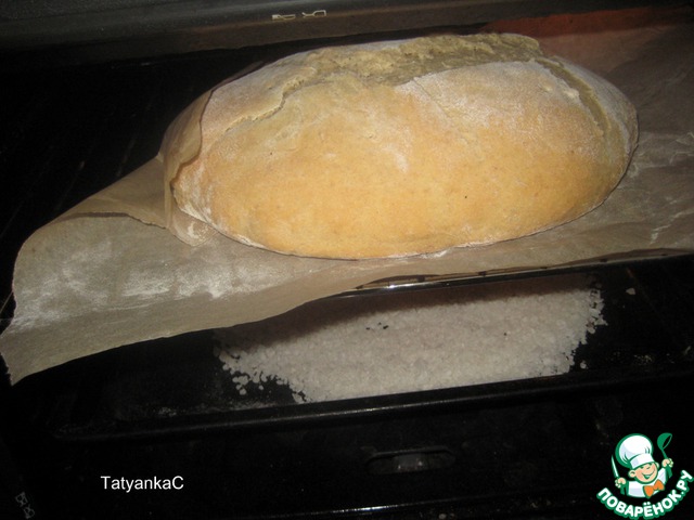 Когда духовка нагреется - тесто из корзинки выложите на пергамент, сделайте надрезы и положите на горячую соль (либо камень),
