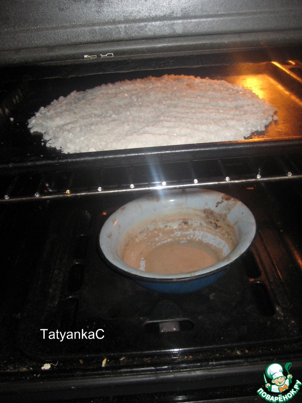 Духовку разогреваем до 220град. Так же в ней разогреваем миску (сковороду) для пара и пекарский камень (у меня его роль выполняет противень с насыпанным на нем крупной солью в 1,5см высотой). Это - импровизированный ПОД.