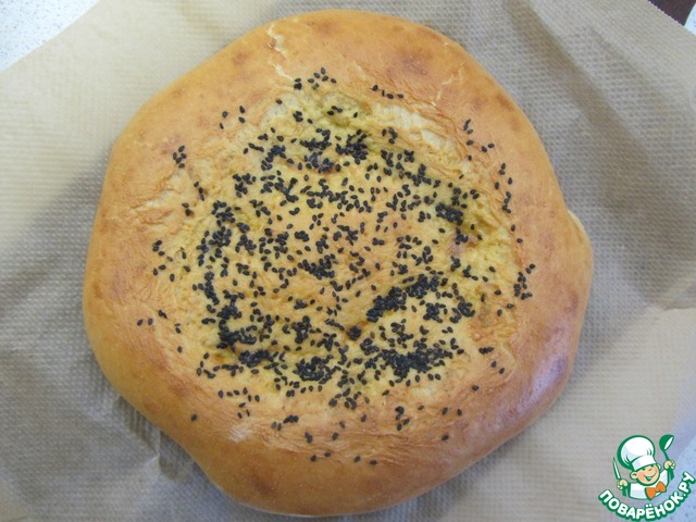 На присыпанной мукой поверхности (я взяла просто бумагу для выпечки, положив на большую разделочную доску ) сформовать лепешку, пальцами придавливая середину. У меня не получалось больше 23 см в диаметре. Оставить для расстойки, укрыв полотенцем - при комнатной Т*= 21-22*С часа 1,5. Серединку наколоть (я пользуюсь просто вилкой), смазать взболтанным яйцом и присыпать кунжутом (любым - светлым или темным), льном, тмином. Мне больше нравится смешивать кунжут и чернушку - аромат сильнее.