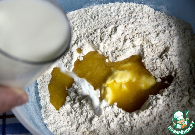 Добавить в мучную смесь теплое растопленое сливочное масло, желток, постепенно ввести молоко.