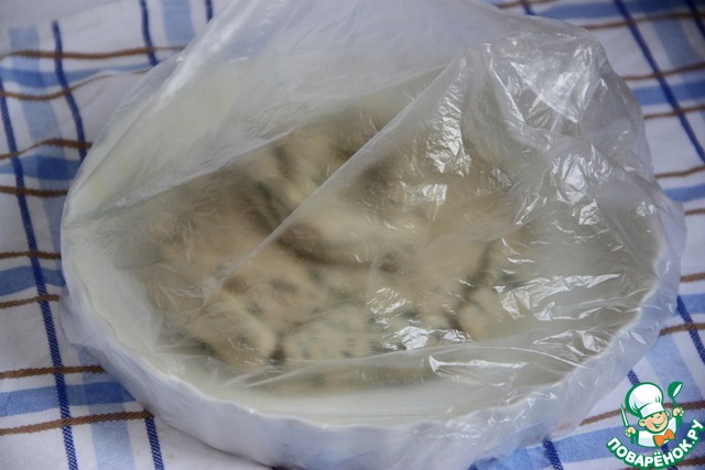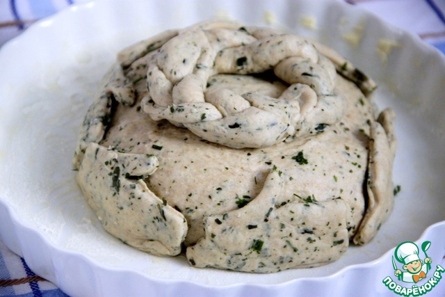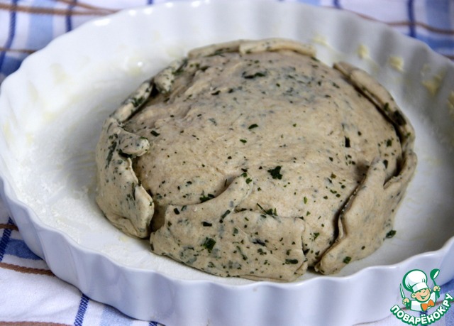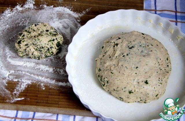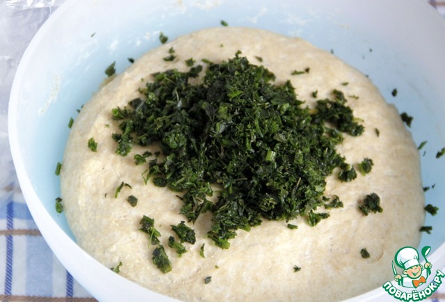 В поднявшееся тесто вмесить травы (у меня - из заморозки, готовая смесь 7 трав).