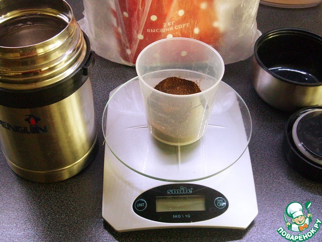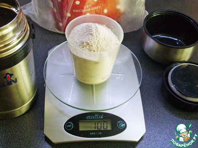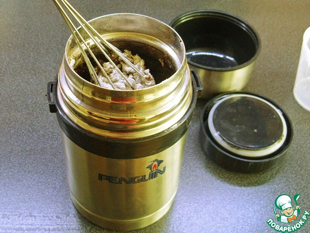 Термос с широким горлом споласкиваем кипятком и заливаем в него 100 г воды температурой 50 град Ц. Всыпаем в термос 100 г ржаной муки, 50 г ржаного ферментированного солода и раздробленные в ступке пряности (4 г). Размешиваем. Продолжая мешать, вливаем в термос 200 г кипятка. Закрываем термос крышкой и ждём 2 часа.