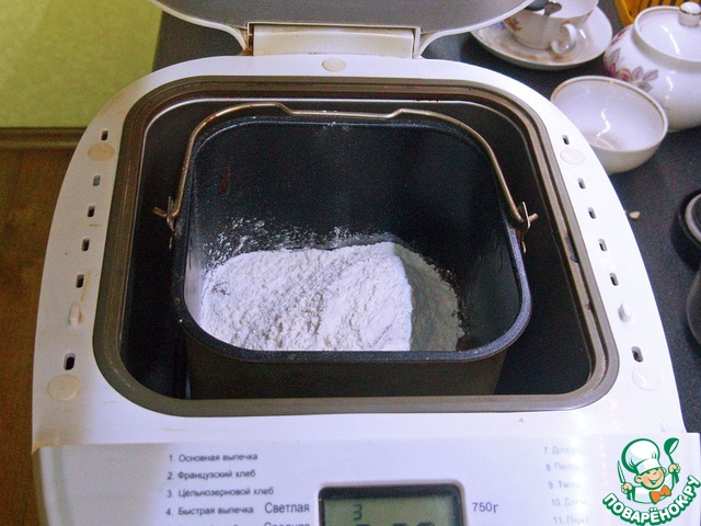 Перекладываем заварку из термоса в ведёрко хлебопечки. Добавляем 150 г пшеничной муки, 3 г сухих дрожжей и 50 г воды. Включаем режим замеса теста. Ненадолго. Через пять минут выключаем хлебопечку. Ждём готовности опары. Это тот момент, когда поднявшаяся было опара начнёт опадать. Ждать придётся около трёх часов.