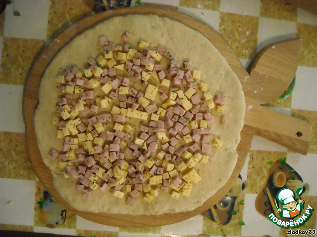 Пока тесто отдыхает, подготавливаем начинку. Сыр и ветчину режем мелкими кубиками. Смешиваем и по желанию добавляем нарезанный укроп и петрушку.