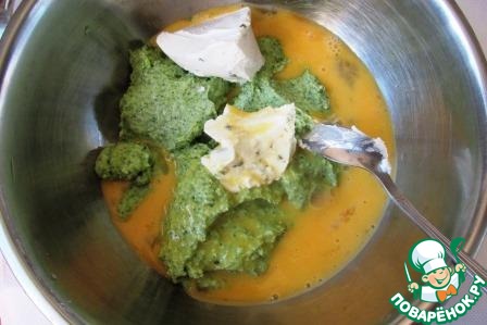 Смешиваем в миске брокколи, натертый сыр, творог, чуть взбитые яйца и мелко нарезанный укроп.