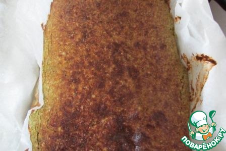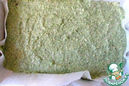 Застилаем форму бумагой для выпечки и выливаем капустное тесто, разравниваем тонким слоем, приблизительно 1 см, уплотняем.