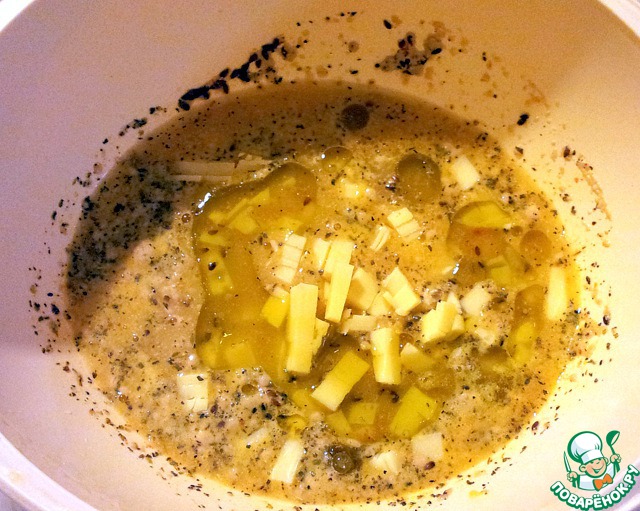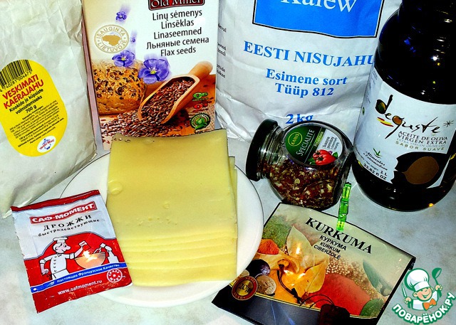 Ингредиенты для хлеба - мука пшеничная и овсяная, дрожжи быстродействующие, сыр твёрдый, льняное семя, смесь из сушенных томатов и чеснока, куркума, соль, сахар, тёплая вода, оливковое масло.