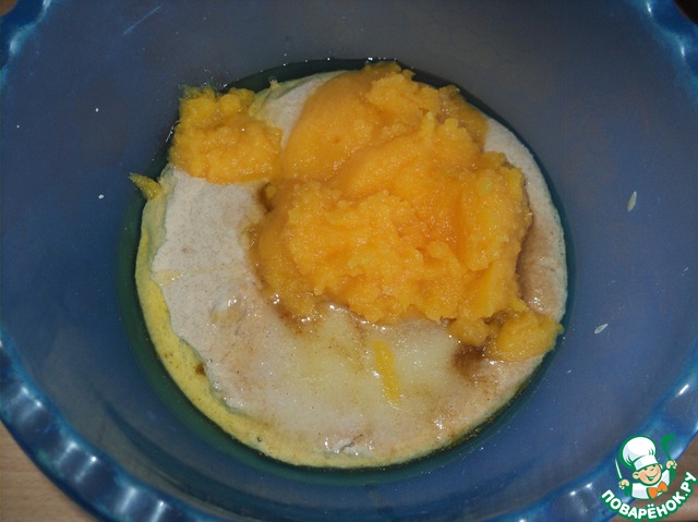 Замешиваем тесто: в миску выкладываем закваску (о ней подробно я писала в своём рецепте по приготовлению ржаного хлеба), измельчённую в блендере тыкву, воду, сахар, соль, молотый имбирь, масло растительное. Муку добавляем постепенно. Возможно, потребуется немного больше муки, чем я указала.