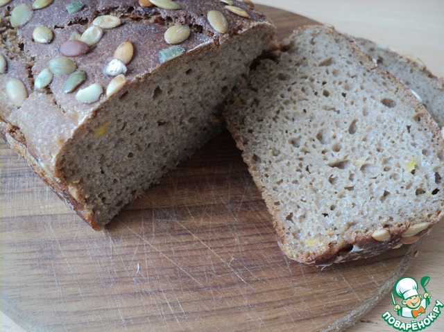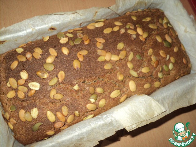 Сверху посыпаем тыквенными семечками и даём тесту ещё раз подняться в форме. Сбрызгиваем поверхность теста водой (можно из пульвелизатора) и выпекаем при температуре 180 градусов 50-60 минут.