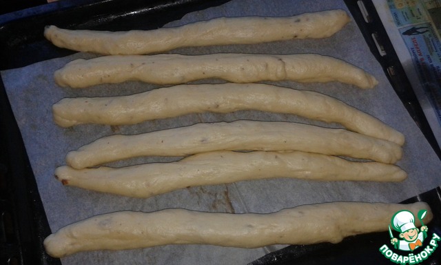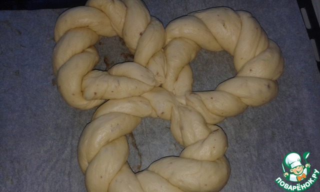 Из каждых двух жгутов сделать "косы", свернув в кольцо, и уложить так, чтобы они соединялись между собой. Оставить расстаиваться 30-40 минут.