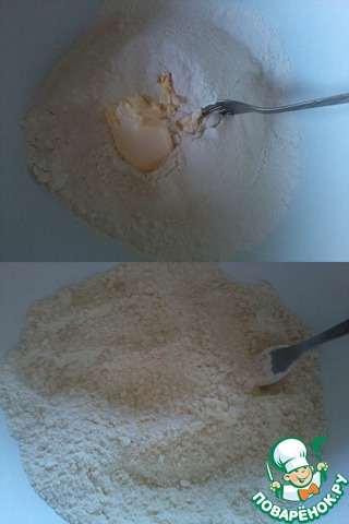 В просеянную муку (300 г) добавить масло сливочное (1 ст. л.) и порубить ножом (или как я вилкой=) до тех пор пока смесь не станет напоминать крошку.