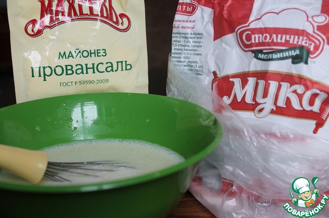 Дрожжи развести в теплой воде, добавив сахар. Подождать пока они подойдут Мне в этот раз попались не очень хорошие и шапка была совсем маленькая ( ( (. Потом к ним добавить 2, 5 ст л масла и яйцо. Тщательно перемешать.
