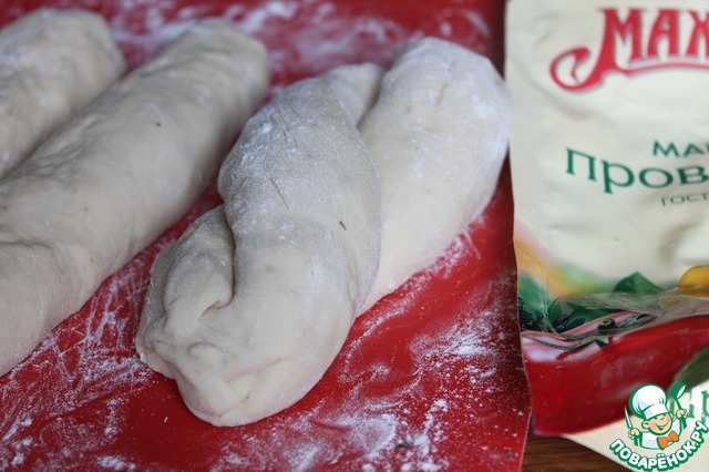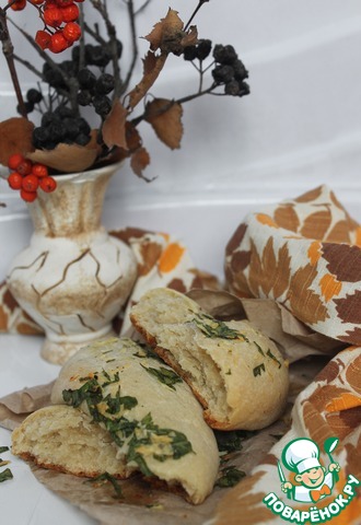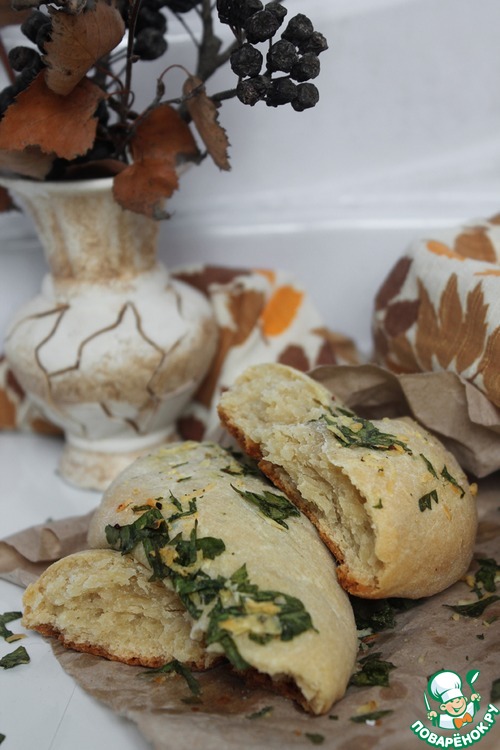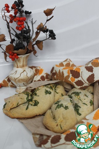 Тем временем разогреваем духовку. В оставшееся масло добавляем измельченный чеснок и петрушку. Из подошедшего теста сначала формируем 4 жгута и скручиваем их попарно в плетенку. Смазываем каждую ароматной смесью, даем еще немного подойти и отправляем в духовку на минут на 30 при 180 градусах.