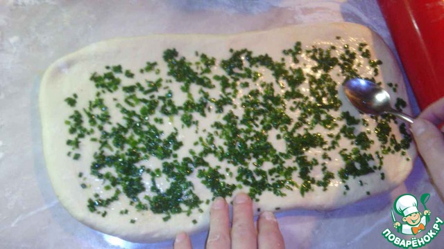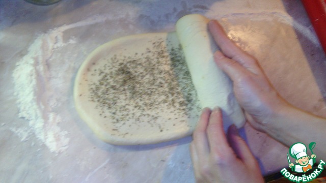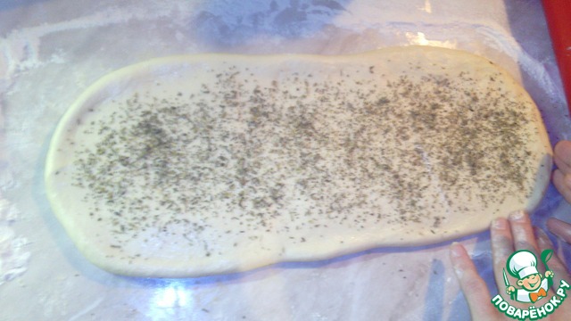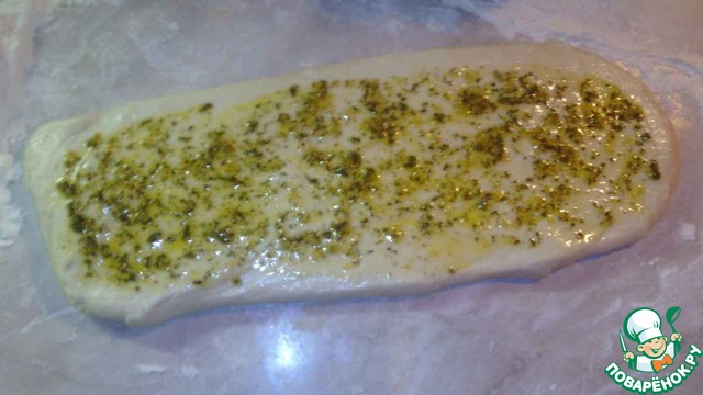 Через час после замеса теста начинается самое интересное) Смазываем растительным маслом стол, нож и свои руки, чтоб тесто не липло. Выкладываем его на стол, разрезаем ножом на три части. Каждую часть раскатываем смазанной маслом скалкой в прямоугольник. Намазываем тесто чесночной и луковой начинкой, третье - посыпаем прованскими травами без масла. Чесночная начинка.