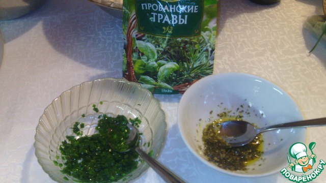 Берем готовую приправу " Прованские травы" или сами составляем смесь душистых трав по вкусу. Зеленый лук промываем, мелко режем, с 1 ч. л. растительного масла пропариваем в микроволновке на максимальной мощности 1 минуту. Зубчик чеснока измельчаем ( я в чеснокодавилке) смешиваем с 1 ч. л. растительного масла, можно еще приправу по вкусу. Я добавила к чесноку сушеный эстрагон 1 ст. л., перетертый руками.