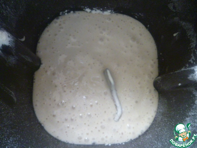 На дно ведерка хлебопечки насыпать 5 столовых ложек просеянной муки, сверху 11-12 столовых ложек пшеничной закваски на пике активности.