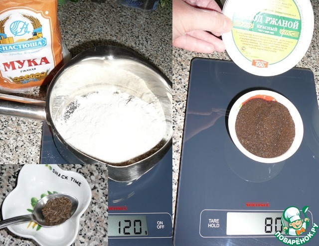 Приготовим муку ржаную, солод красный ржаной и семена тмина (я использовала в зернах).