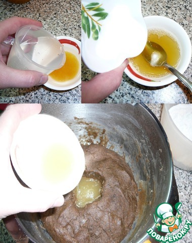 Водой разведем мёд, соль и вольем в опару.