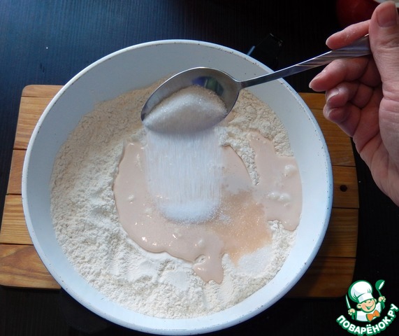 Когда опара готова, просеиваем оставшуюся муку, смешиваем ее с солью, выливаем опару и добавляем сахар. Замешиваем тесто оно будет очень крутым, но это не страшно так как еще нужно добавить масло. Тесто вымешиваем около 10 минут.