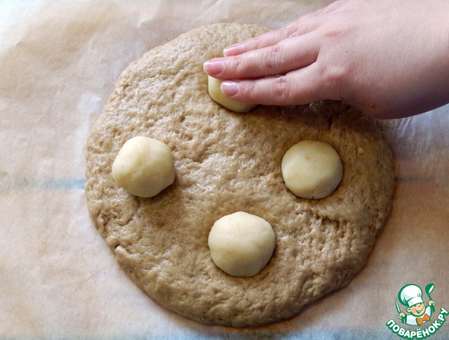 Подошедшее тесто еще немного месим, формируем из него круглый хлеб диаметром не больше 16 см, удобно сделать это сразу на пекарской бумаге, у меня получился диаметр 20см. и хлеб получился низкий. Марципан делим на 4 части скатываем шарики, укладываем на тесто придавливая их. Смазываем сверху молоком, ставим выпекаться на 25-30 минут.