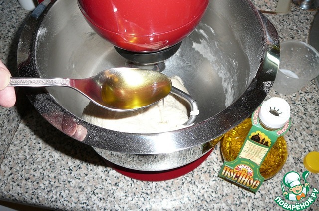 После 5 минут замеса, вводим растительное масло по одной ложке, каждый раз вымешивая минуты по 2-3.