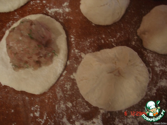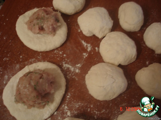 Приготовить из теста одинаковые шарики, примять их рукой, положить фарш.