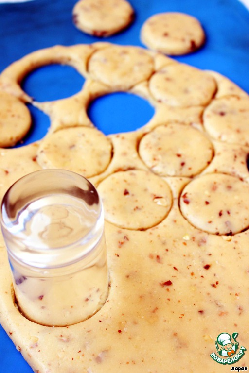 Раскатать тесто в пласт толщиной 0,7 см и вырезать формой небольшие кружочки. Положить заготовки на пекарскую бумагу и отправить в разогретую до 180 градусов духовку на 10 минут.