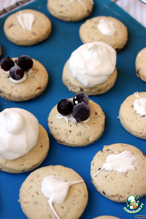 Достаем заготовки из духовки, немного смазываем каждую белковой пеной для того, чтобы с них не скатывались ягоды, на каждую заготовку кладем по 3-4 ягодки и отсаживаем сверху белки из кондитерского мешка. Отправляем снова в духовку под гриль на 5 минут до легкого румянца, затем температуру снижаем до 110 градусов, переводим духовку на нижний режим и готовим сабле еще 30 минут.