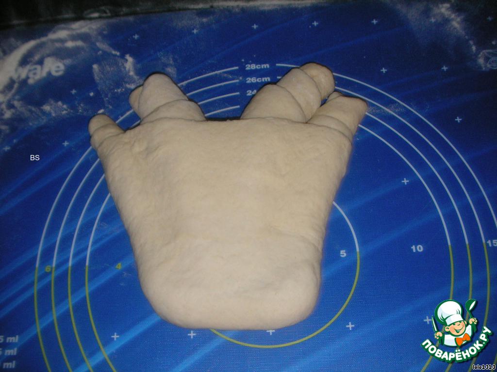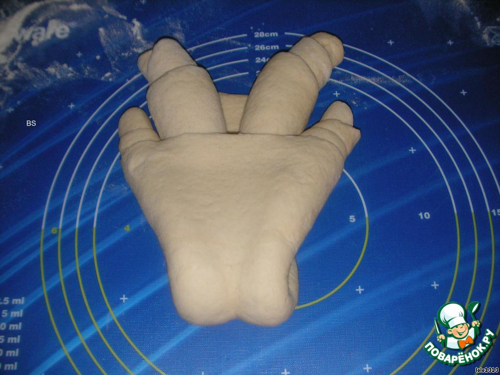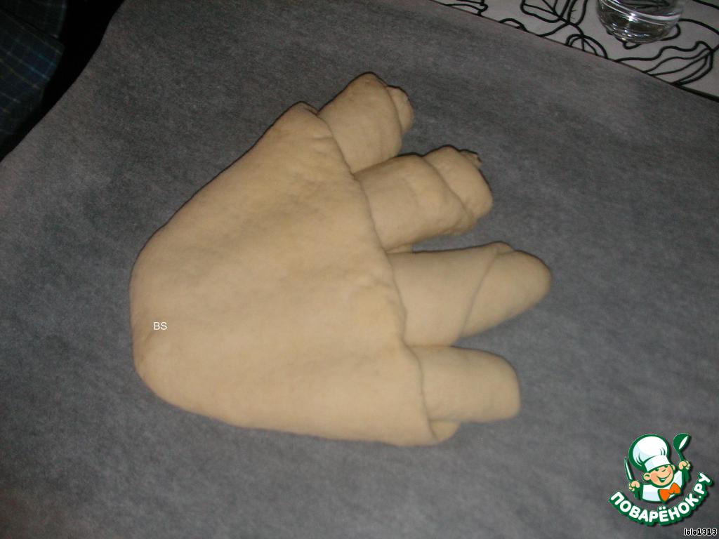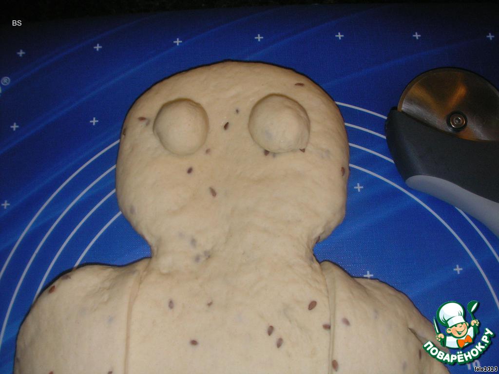 Тесто (на 2 хлеба): 1 ст.кефира + 1 ст.воды, 1 ч.л.соли, 1 ст.л. сахара, 2 ст.л сливочного масла, 2 ст.л растительного масла, дрожжи сухие - 1 пакетик, мука - 4 ст.(примерно). Замесить тесто в хлебопечке или самим. Дальше придать хлебу форму согласно изображениям.