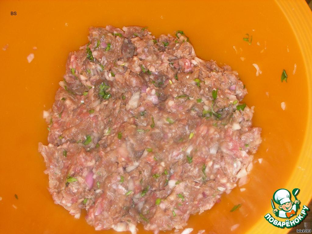 3)мясной фарш + репчатый лук + зелень + немного воды + соль, перец.