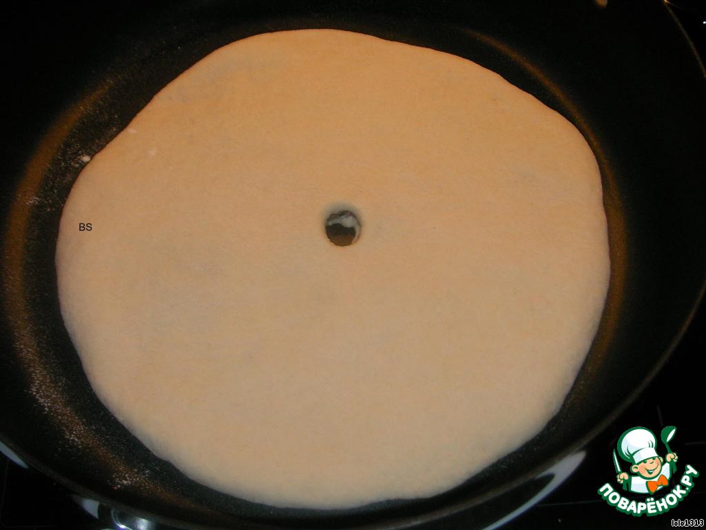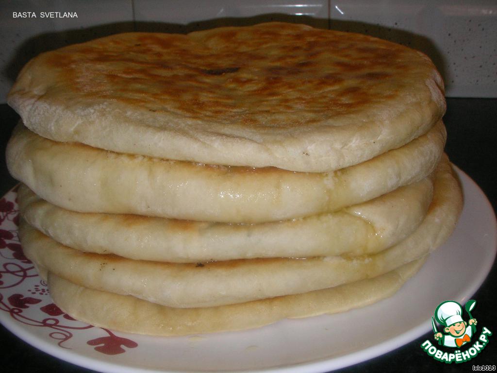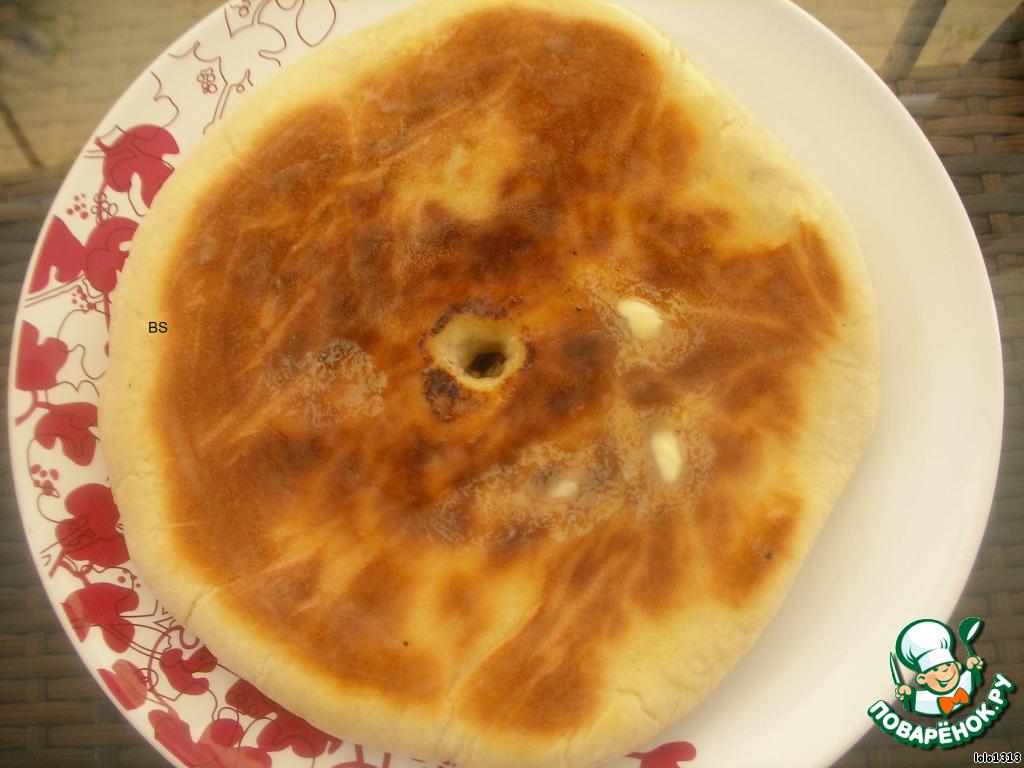 В осетинские пироги обязательно добавляют чабер (можно заменить на "провансальские" или "итальянские травы"). Выпекать на сухой сковородке с двух сторон до готовности. Выкладывая горячую лепёшку на тарелку обильно смазать сливочным маслом. Всегда выпекают нечётное кол-во пирогов (3,5,7....). Если выходит чётное число, выкладывают на разные тарелки. Приятного аппетита!