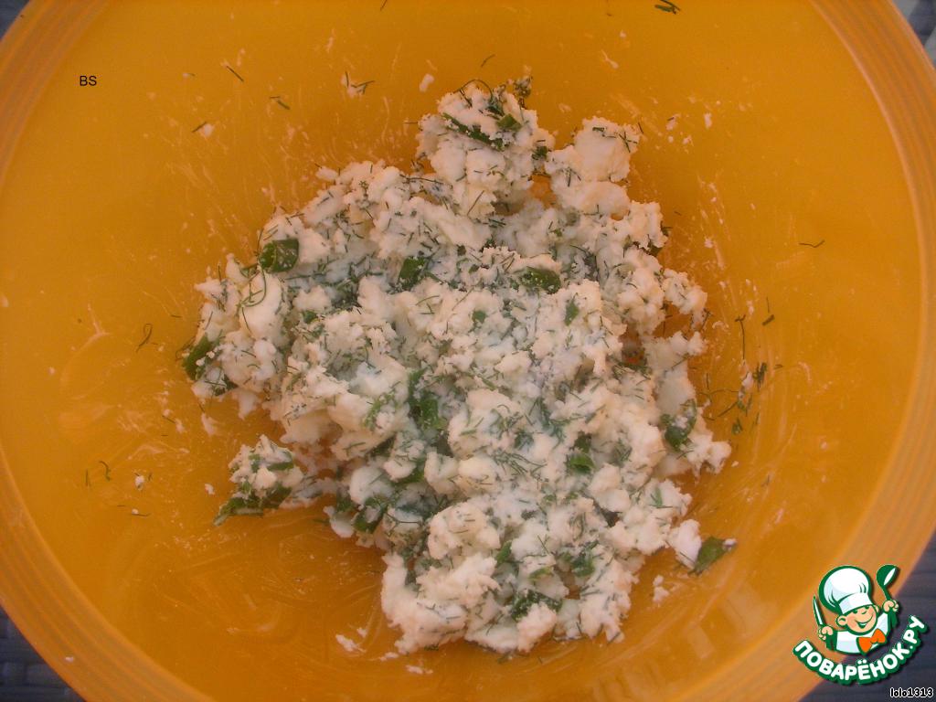 1)сыр + зелёный лук + зелень + соль, перец.