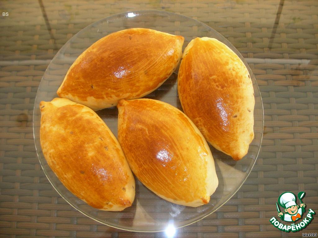 Тесто (на 5 пирогов): 1 ст.кефира + 1 ст.воды, 1 ч.л.соли, 1 ст.л. сахара, 2 ст.л слив.масла, 2 ст.л растит.масла, дрожжи сухие - 1 пакетик, мука - 4 ст.(примерно). Замесить тесто в хлебопечке или самим.