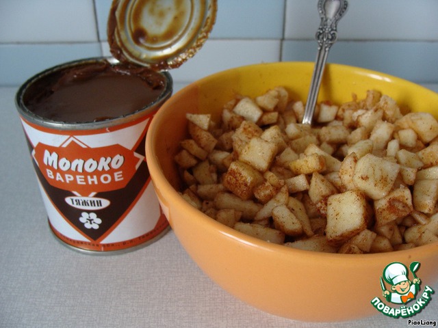 В то время как готовим начинку: то есть, открываем баночку с варёной сгущенкой и на мелкие кубики режем яблочки (которые по своему вкусу и усмотрению посыпаем сахаром и корицей), ставим растапливать сливочное масло (можно, конечно, заменить маргарином, разницы вообще не чувствуется).