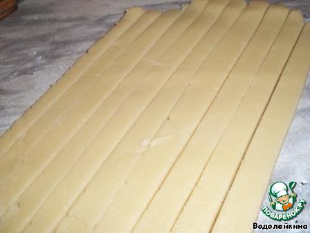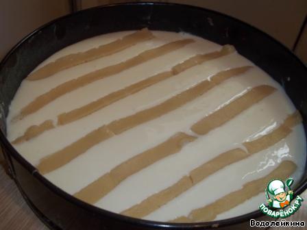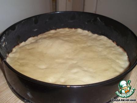 Круглую форму (диаметром 22-25 см) смазать маслом и присыпать мукой. Выложить на нее большую часть теста. Поставить в разогретую до 200*С духовку на 12-15 минут. Оставшееся тесто разрезать на длинные полоски шириной 1 см.