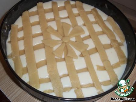 Положить в нее начинку, сверху выложить решетку из нарезанных полосок теста.