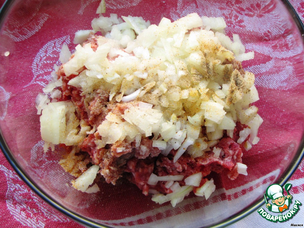 Фарш смешиваем с мелко нарезанным луком, черным перцем, творожной сывороткой и уксусом. В исходном рецепте ее нет. Но чуду часто готовят с кислой сывороткой, ее специально оставляют в теплом месте на несколько дней. Получается сывороточный "уксус".