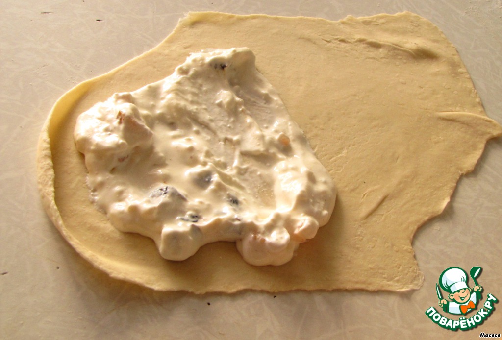 На половину овала выкладываем ложку начинки и оставляем место по краям. Начинку как бы слегка размазываем по тесту.