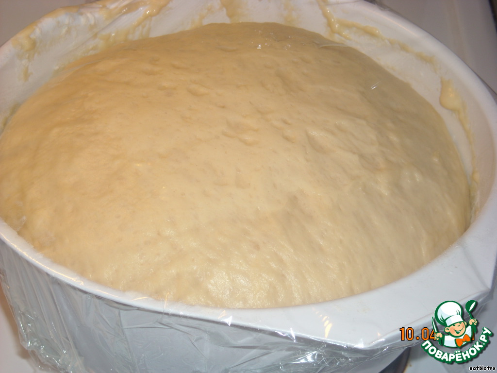 Добавить смесь муки и сахара, постепенно добавляя остальную муку. Не добавляйте сразу всю муку - может уйти и меньше, все зависит от качества Вашей муки. Тесто должно быть очень мягким, приятным, но не липнующим к рукам. Накрыть пищевой пленкой и чистым полотенцем и поставить в теплое место подходить примерно на 1 час. Тесто должно увеличиться в два раза.
