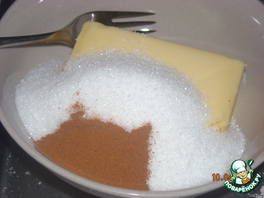 Готовим начинку. Мягкое сливочное масло растереть с 100г сахара и 1 ч. л. корицы.