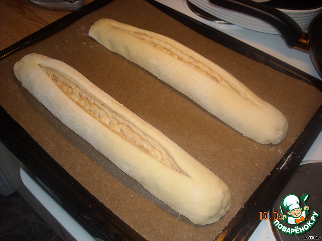 Положить их на застеленный пекарской бумагой противень. Сделать не очень глубокий надрез ножом вдоль каждого рулетика.