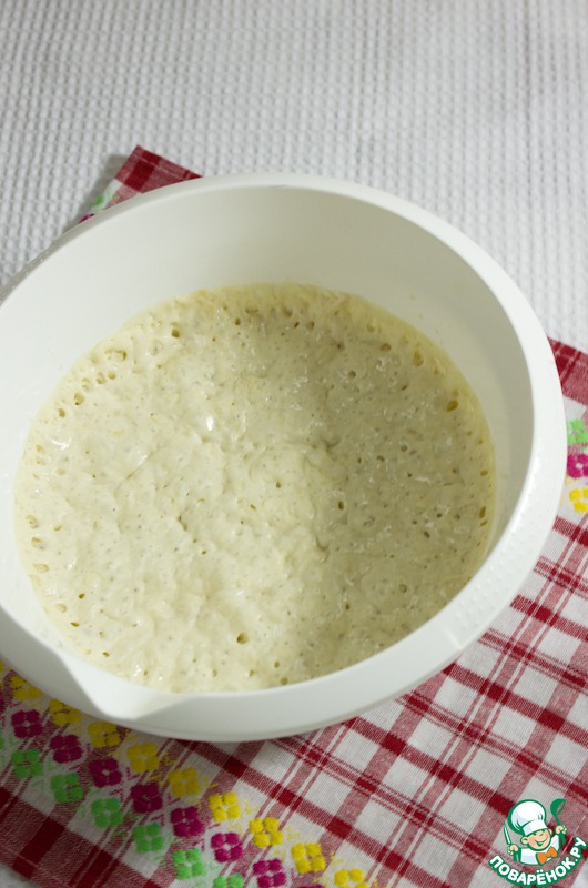Начать следует с опары: смешиваем 110 г муки, 2 г дрожжей и 80 мл теплой кипяченной воды. Вода не горячая, а теплая. Тщательно перемешиваем и оставляем в теплом месте, температура примерно 30С.