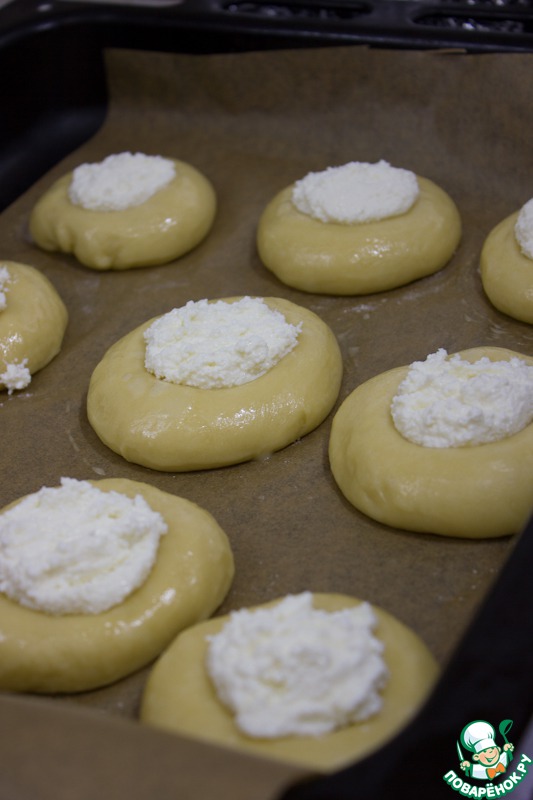 При помощи стаканчика или другой подходящей емкости, предварительно обмакнув ее в муку, делаем выемки для творога и оставляем для последнего подъема минут на 30.