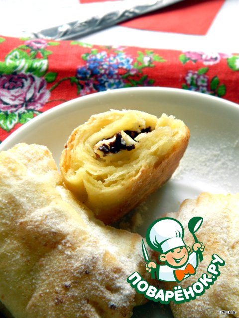 Затем вырезать из теста квадраты, добавить начинку, у меня это белый и темный шоколад. Еще можно взять любое варенье или джем.