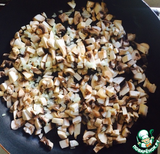 Мелко нарезаем шампиньоны (размером примерно 1х1 см), режем лук. На сухой сковороде под крышкой поджарить грибы с луком минуты 2, затем добавить соевый соус, чеснок, мелко рубленный укроп и жарить уже без крышки до выпарения жидкости. Ставим остуживать.